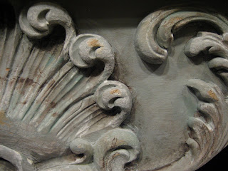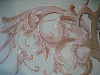This was work done by artisans based on their standards. They painted many things that only a trained eye would be able to appreciate. One day, when climbing the scaffolding, I was working about fifteen feet up near the ceiling. I looked at the small "nails" holding the blue ribbon and noticed a faint shadow painted for each nail! From the ground, this is not discernible but, it was painted because, the artist knew it would be there in nature. No corners were cut, no details were left out. It was a pure joy to work on this project and learn that stenciling can still be an art form, depending on who holds the brush.....